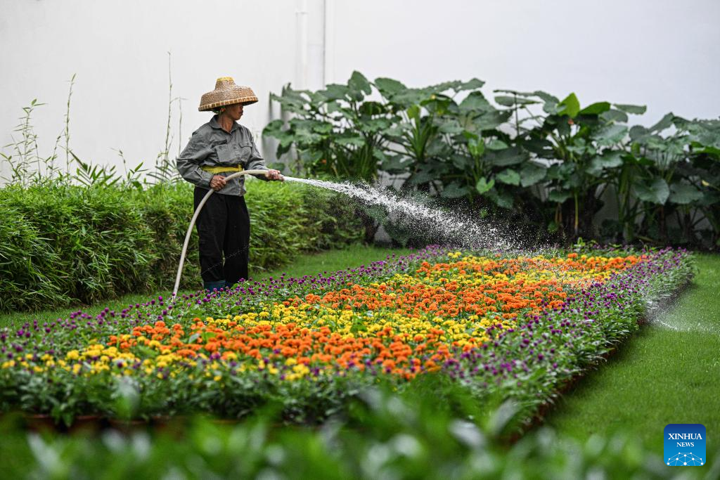 BOAO, 27 marzo, 2026 (Xinhua) -- Una trabajadora riega las plantas en el exterior de la sede de la Conferencia Anual 2026 del Foro de Boao para Asia (FBA), en Boao, en la provincia de Hainan, en el sur de China, el 27 de marzo de 2026. Desde que se estableció el FBA hace 25 años, el concepto de operaciones verdes ha sido un principio fundamental de sus conferencias anuales. (Xinhua/Pu Xiaoxu)
