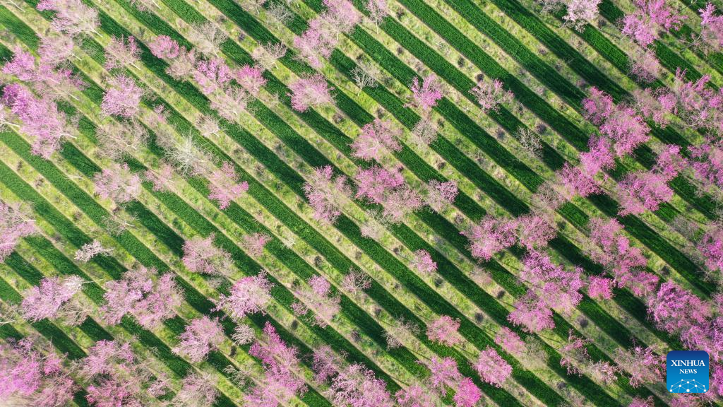 BEIJING, 31 marzo, 2026 (Xinhua) -- Vista aérea tomada con un dron el 30 de marzo de 2026 de flores en plena floración, en Zunhua, en la provincia de Hebei, en el norte de China. (Xinhua/Liu Mancang)
