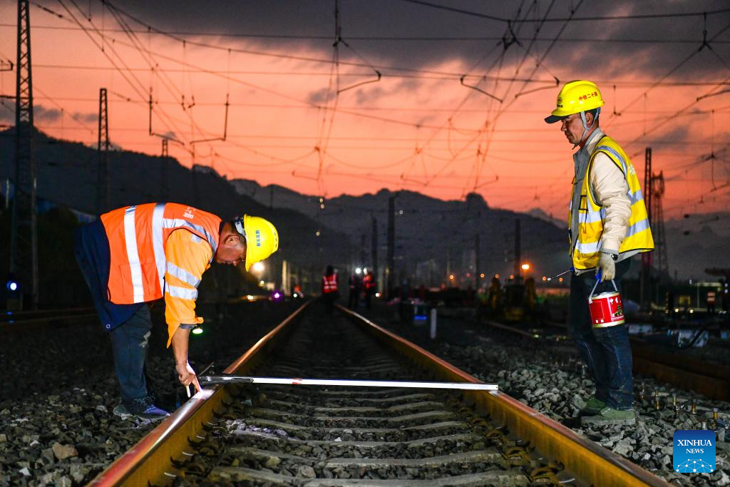 DUYUN, 31 marzo, 2026 (Xinhua) -- Imagen del 30 de marzo de 2026 de trabajadores ferroviarios atareados en el proyecto de mejora de la estación de Lyuyinhu a lo largo de la línea de extensión sur-norte del Ferrocarril Weng'an-Machangping, en la provincia de Guizhou, en el suroeste de China. La modernización de la estación de Lyuyinhu concluyó el lunes, estableciendo una base sólida para la plena operación de la línea de extensión sur-norte del Ferrocarril Weng'an-Machangping. La línea de extensión de 148 kilómetros de longitud es un proyecto clave para el transporte ferroviario de mercancías en la provincia de Guizhou. (Xinhua/Yang Wenbin)