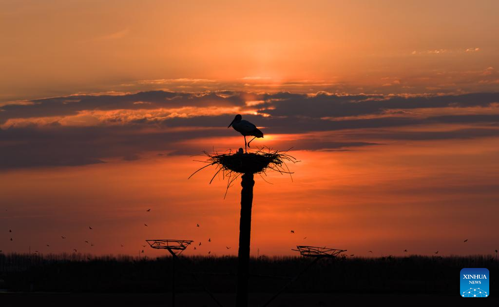 HARBIN, 1 abril, 2026 (Xinhua) -- Vista aérea tomada con un dron el 1 de abril de 2026 de una cigüeña blanca oriental descansando en un nido, en Zhaodong, en la provincia de Heilongjiang, en el noreste de China. (Xinhua/Liu Dapeng)