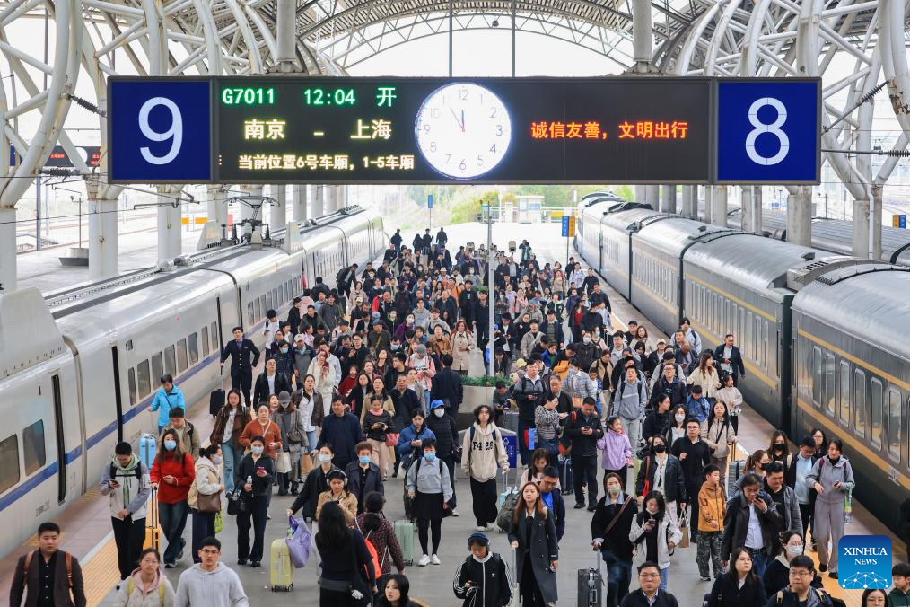 BEIJING, 3 abril, 2026 (Xinhua) -- Pasajeros son vistos en un andén de la Estación del Ferrocarril de Nanjing, en Nanjing, en la provincia de Jiangsu, en el este de China, el 3 de abril de 2026. Se prevé que entre el viernes y el próximo martes, durante la temporada alta con motivo del feriado del Festival Qingming, se registren en China 90,5 millones de viajes de pasajeros en tren, según el Grupo Estatal de Ferrocarriles de China (China State Railway Group Co., Ltd.). De acuerdo con el operador ferroviario nacional, se espera un promedio diario de 18,1 millones de desplazamientos a lo largo de los cinco días de este período viajero, en tanto que el sábado se alcanzaría el pico de ellos, con un total de 21,2 millones para la jornada. (Xinhua/Su Yang)