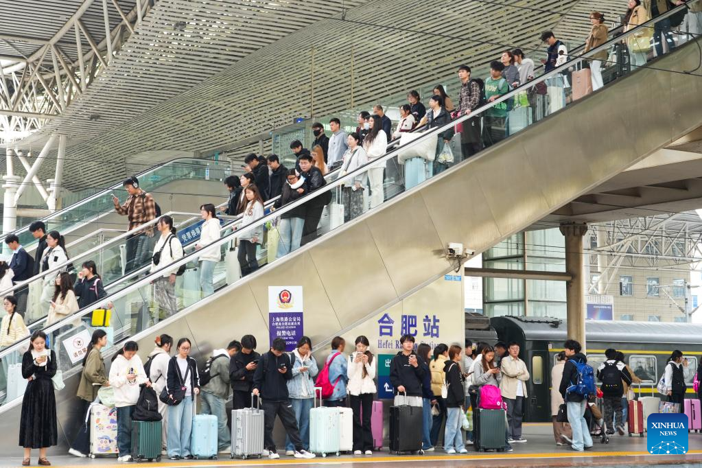 BEIJING, 3 abril, 2026 (Xinhua) -- Pasajeros son vistos en un andén en la Estación del Ferrocarril de Hefei, en Hefei, en la provincia de Anhui, en el este de China, el 3 de abril de 2026. Se prevé que entre el viernes y el próximo martes, durante la temporada alta con motivo del feriado del Festival Qingming, se registren en China 90,5 millones de viajes de pasajeros en tren, según el Grupo Estatal de Ferrocarriles de China (China State Railway Group Co., Ltd.). De acuerdo con el operador ferroviario nacional, se espera un promedio diario de 18,1 millones de desplazamientos a lo largo de los cinco días de este período viajero, en tanto que el sábado se alcanzaría el pico de ellos, con un total de 21,2 millones para la jornada. (Xinhua/Su Nan)