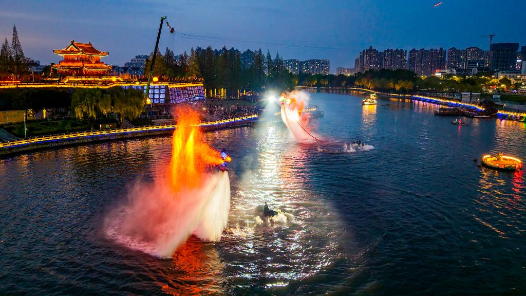 JINGZHOU, 4 abril, 2026 (Xinhua) -- Imagen del 3 de abril de 2026 de una presentación llevada a cabo, en las afueras de la ciudad antigua de Jingzhou, en la provincia de Hubei, en el centro de China. El espectáculo, cuyo objetivo era impulsar el turismo cultural primaveral se representó aquí el viernes por la noche y atrajo a muchos visitantes. (Xinhua/Zhang Mengyao)
