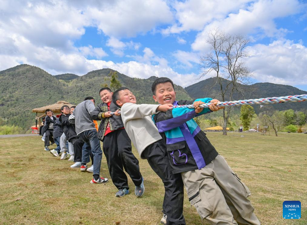 BEIJING, 4 abril, 2026 (Xinhua) -- Imagen del 3 de abril de 2026 de niños asistiendo a un juego de jalar la cuerda en el área escénica de Dieshihuagu, en el distrito autónomo tujia y miao de Youyang, en Chongqing, en el suroeste de China. Las primeras vacaciones de primavera del país para escuelas primarias y secundarias cayó justo antes del feriado de tres días del Festival Qingming, que va del sábado al lunes, en muchas localidades. Los estudiantes tuvieron la oportunidad de participar en una variedad de actividades de ocio. (Xinhua/Ran Chuan)