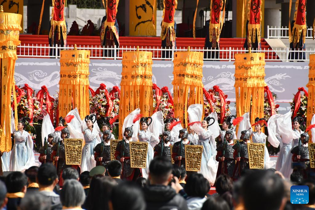 HUANGLING, 5 abril, 2026 (Xinhua) -- Una ceremonia en homenaje a Huangdi, o el Emperador Amarillo, se lleva a cabo en el distrito de Huangling, en la provincia de Shaanxi, en el noroeste de China, el 5 de abril de 2026. Una ceremonia se celebró el domingo para rendir homenaje a Huangdi, quien es considerado como el fundador de la civilización china y ancestro común de todos los chinos. La ceremonia se celebra tradicionalmente en Qingming, o Día de la Limpieza de Tumbas, que este año cae en domingo. (Xinhua/Yao Youming)