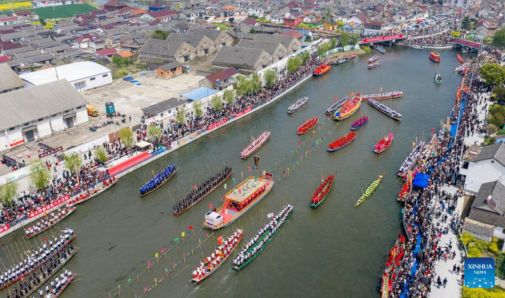 XINGHUA, 5 abril, 2026 (Xinhua) -- Vista aérea tomada con un dron el 5 de abril de 2026 de botes navegando durante la feria de botes de Maoshan, en la ciudad de Xinghua, en la provincia de Jiangsu, en el este de China. La feria anual de botes de Maoshan en Xinghua se celebró el domingo. El evento fue inscrito como patrimonio cultural inmaterial nacional en 2014. (Xinhua/Zhou Shegen)
