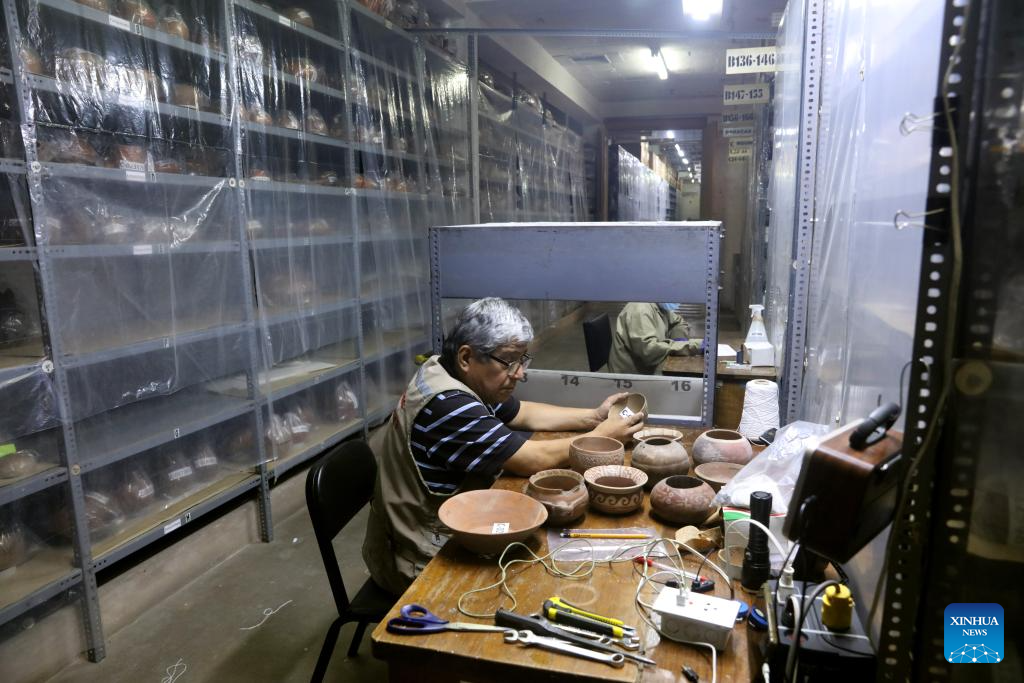 Imagen del 23 de marzo de 2026 de un trabajador del Museo Nacional de Arqueología, Antropología e Historia del Perú (Mnaahp) observando piezas arqueológicas, en Lima, Perú. El puerto de Chancay, ubicado a 80 kilómetros al norte de la ciudad de Lima, trasciende su función comercial al facilitar el intercambio cultural entre Perú y China, dos civilizaciones milenarias, afirmó Rafael Varón. (Xinhua/Mariana Bazo)