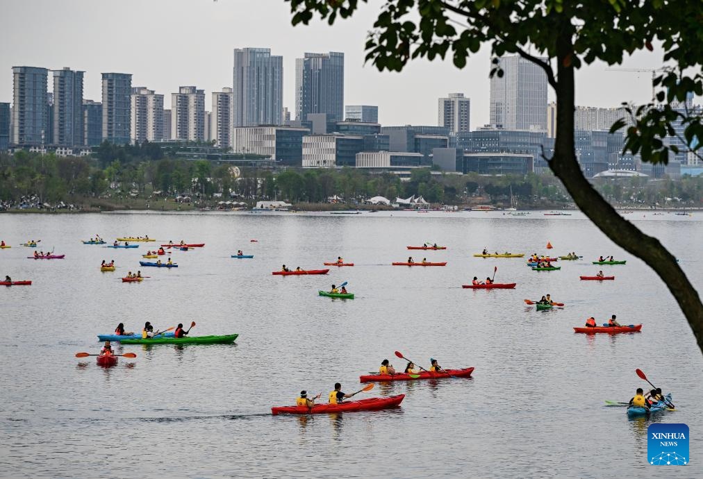 BEIJING, 7 abril, 2026 (Xinhua) -- Imagen del 4 de abril de 2026 de turistas experimentando el kayak en un lago de la Nueva Area de Tianfu, en Chengdu, en la provincia de Sichuan, en el suroeste de China. China registró 135 millones de viajes turísticos nacionales durante el feriado de tres días por el Festival Qingming, un aumento interanual del 6,8 por ciento, mientras que el gasto turístico creció un 6,6 por ciento hasta alcanzar cerca de 61,37 billones de yuanes (8,9 billones de dólares estadounidenses), según el Ministerio de Cultura y Turismo el martes. (Xinhua/Li Xiangyu)