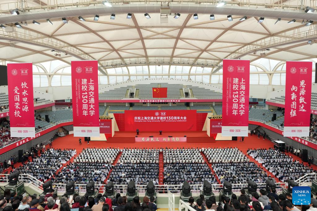 SHANGHAI, 8 abril, 2026 (Xinhua) -- Una ceremonia para conmemorar el 130 aniversario de la Universidad Jiao Tong de Shanghai (SJTU, por sus siglas en inglés) se lleva a cabo en su campus Minhang, en Shanghai, en el este de China, el 8 de abril de 2026. La SJTU celebró el miércoles su 130 aniversario con una ceremonia en su campus Minhang. (Xinhua/Liu Ying)