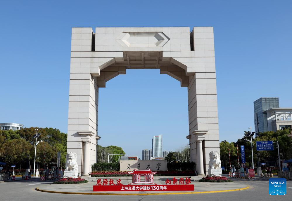SHANGHAI, 8 abril, 2026 (Xinhua) -- Imagen del 8 de abril de 2026 de una instalación conmemorativa del 130 aniversario de la Universidad Jiao Tong de Shanghai (SJTU, por sus siglas en inglés) frente a una puerta de su campus Minhang, en Shanghai, en el este de China. La SJTU celebró el miércoles su 130 aniversario con una ceremonia en su campus Minhang. (Xinhua/Liu Ying)