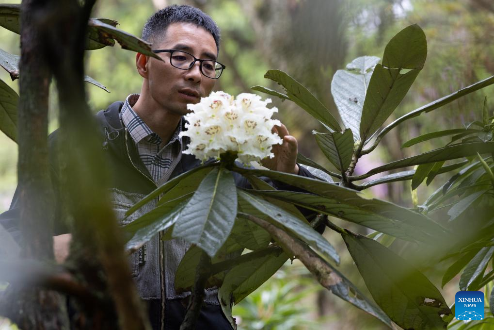 CHENGDU, 9 abril, 2026 (Xinhua) -- Imagen del 8 de abril de 2026 del investigador Wang Fei inspeccionando ejemplares de gran rododendro chino florecientes en el Jardín Botánico Subalpino del Oeste de China, en Chengdu, en la provincia de Sichuan, en el suroeste de China. Un lote de ejemplares de gran rododendro chino, una especie de rododendro alpino, floreció recientemente por primera vez aquí después de 29 años de cultivo artificial. (Xinhua/Jiang Hongjing)
