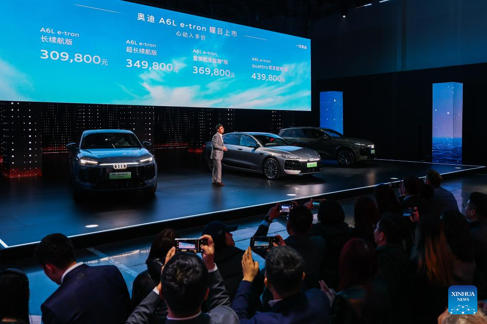 CHANGCHUN, 10 abril, 2026 (Xinhua) -- Imagen del 10 de abril de 2026 de un evento de lanzamiento para el A6L e-tron, un vehículo eléctrico de batería, marcando su debut en el mercado chino en Audi FAW NEV Co., Ltd., en Changchun, en la provincia de Jilin, en el noreste de China. (Xinhua/Xu Chang)