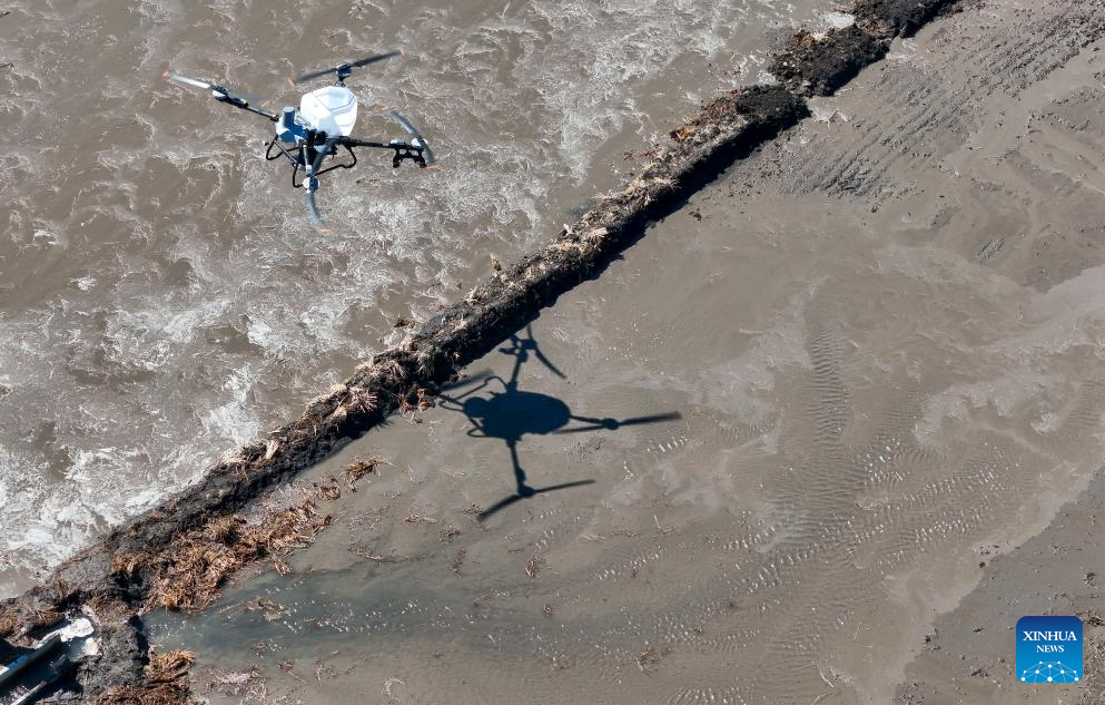 SHUANGYASHAN, 10 abril, 2026 (Xinhua) -- Imagen tomada con un dron el 9 de abril de 2026 de un dron agrícola rociando fertilizante en un campo de arroz de Youyi Farm Co., Ltd. perteneciente al Grupo Beidahuang, en Shuangyashan, en la provincia de Heilongjiang, en el noreste de China. Heilongjiang, una importante zona productora de cereales en China, ha entrado en la temporada de arado de primavera para el arroz. (Xinhua/Wang Song)