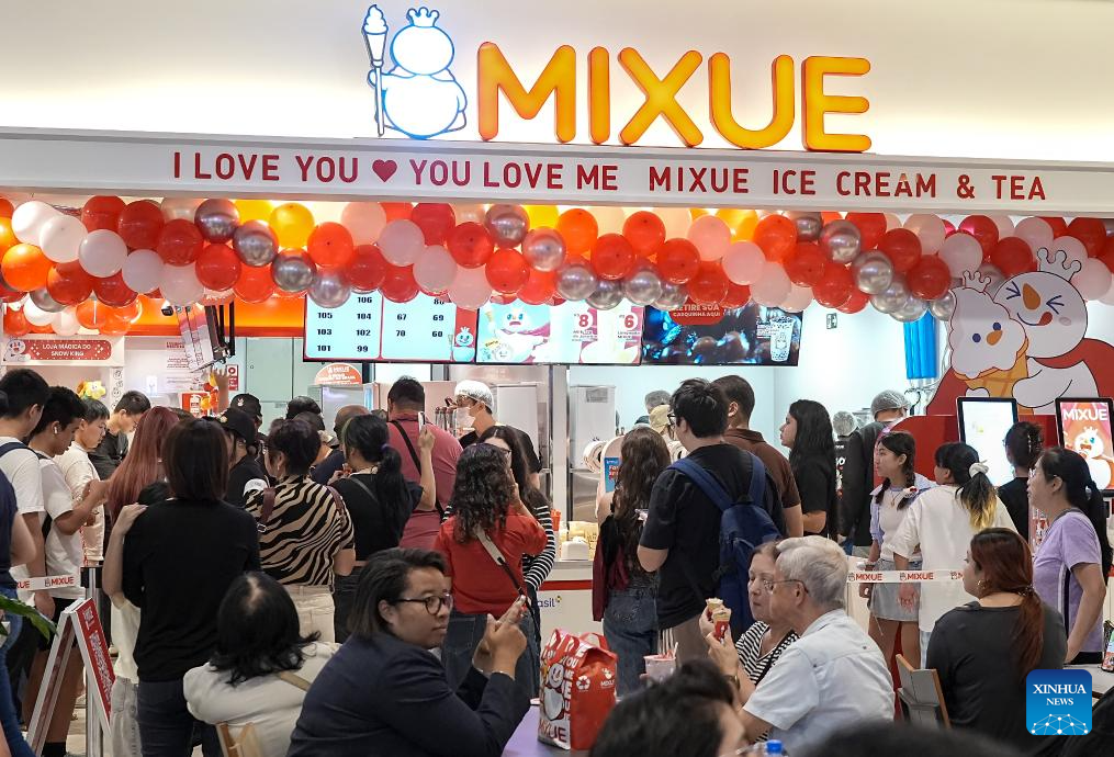 SAO PAULO, 11 abril, 2026 (Xinhua) -- Clientes degustan productos en la primera tienda china Mixue en Brasil durante su inauguración en un centro comercial, en Sao Paulo, Brasil, el 11 de abril de 2026. Mixue abrió su primera tienda en Brasil y según un representante de la empresa también comenzará la construcción de una fábrica para su cadena de suministro en el país. Se espera que genere 25.000 empleos en el futuro. (Xinhua/Paulo Lopes)