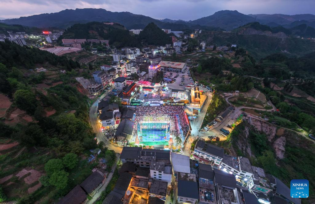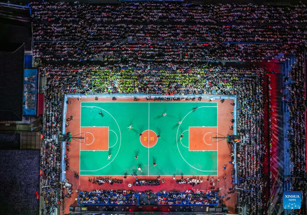 TAIJIANG, 12 abril, 2026 (Xinhua) -- Vista aérea tomada con un dron el 11 de abril de 2026 de la cancha de baloncesto durante el partido final entre la ciudad de Kaili y el distrito de Yanhe en la Competencia de Baloncesto Rural de China 2026, en la aldea de Taipan, en el distrito de Taijiang, en la provincia de Guizhou, en el suroeste de China. (Xinhua/Yang Wenbin)