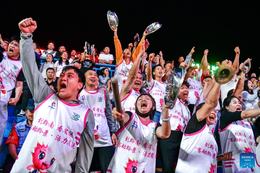 TAIJIANG, 12 abril, 2026 (Xinhua) -- Imagen del 11 de abril de 2026 de aficionados portando trajes étnicos mientras animan durante el partido final entre la ciudad de Kaili y el distrito de Yanhe en la Competencia de Baloncesto Rural de China 2026, en la aldea de Taipan, en el distrito de Taijiang, en la provincia de Guizhou, en el suroeste de China. (Xinhua/Yang Wenbin)