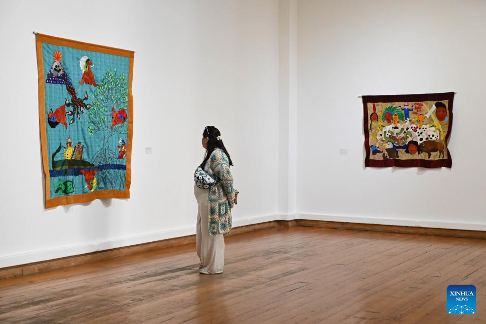 SANTIAGO, 12 abril, 2026 (Xinhua) -- Imagen del 9 de abril de 2026 de una mujer visitando la exposición "En la oscuridad, nuestros antepasados nos recuerdan quiénes somos" de la artista mexicana, Priscilla Dobler Dzul, en el Museo de Arte Contemporáneo (MAC), en Santiago, capital de Chile. La artista de origen maya yucateco, Priscilla Dobler Dzul, exhibe por primera vez en el MAC de Chile sus obras textiles que narran historias de injusticias medioambientales, bordadas en una variedad de formas y colores. (Xinhua/Jorge Villegas)