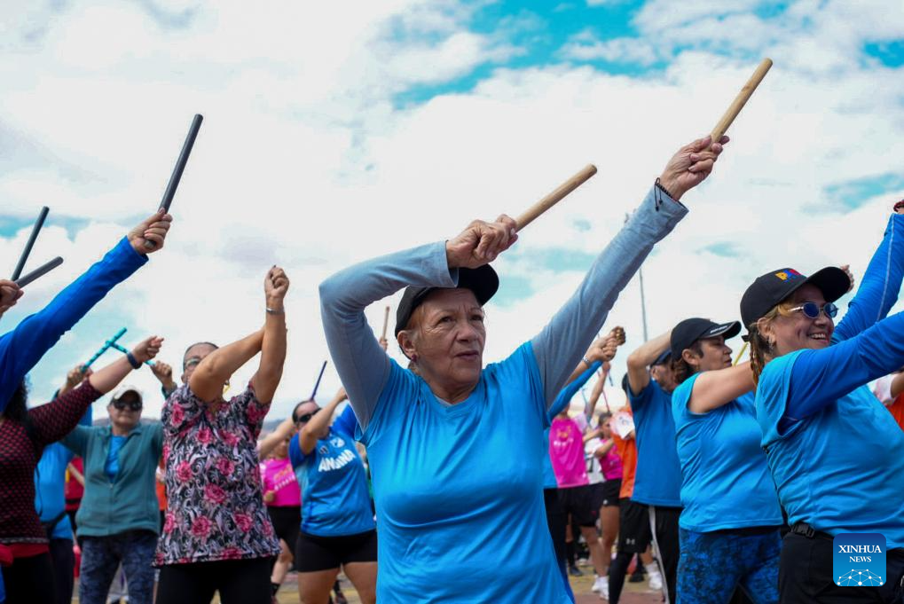 BOGOTA, 12 abril, 2026 (Xinhua) -- Una mujer participa en una sesión de actividad física en el marco del Día Mundial de la Actividad Física, en Bogotá, capital de Colombia, el 12 de abril de 2026. Miles de personas participaron el domingo en una jornada dedicada a la salud y el bienestar en el Parque El Tunal, en la zona sur de Bogotá, capital de Colombia, a propósito del Día Mundial de la Actividad Física que se conmemora cada 6 de abril en la nación sudamericana. (Xinhua/Andrés Moreno)