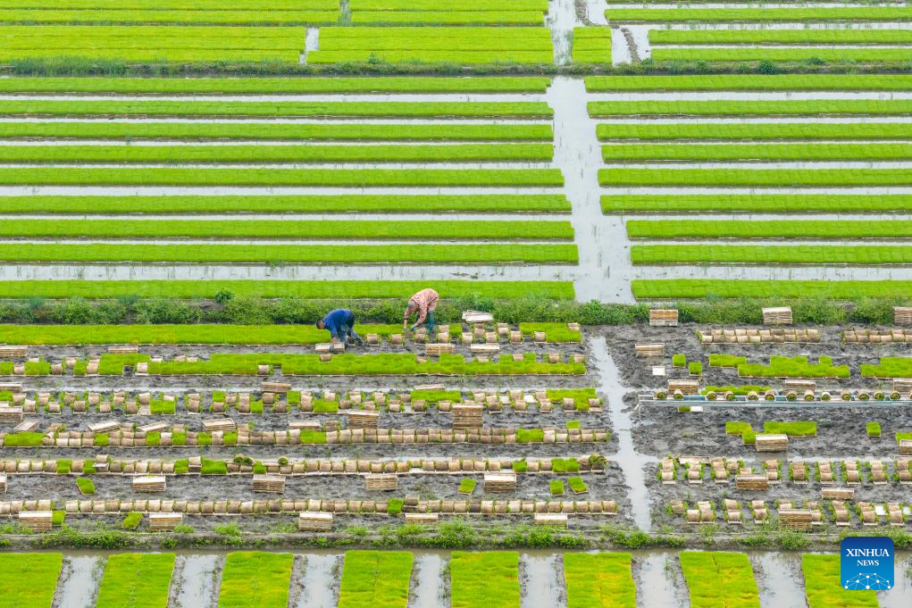 BEIJING, 13 abril, 2026 (Xinhua) -- Vista aérea tomada con un dron el 10 de abril de 2026 de agricultores transportando plántulas de arroz de temporada temprana, en la aldea de Shangtang del poblado de Huangjiabu, en Yuyao, en la provincia de Zhejiang, en el este de China. (Xinhua/Zhang Hui)