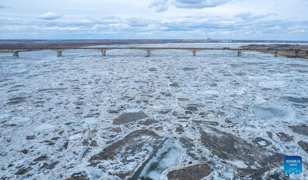 HARBIN, 14 abril, 2026 (Xinhua) -- Imagen tomada con un dron el 13 de abril de 2026 de una vista del hielo a la deriva que flota en la sección Jiamusi del río Songhua, en la provincia de Heilongjiang, en el noreste de China. Gran cantidad de hielo flota sobre la superficie del río Heilongjiang y el río Songhua recientemente debido al aumento de la temperatura. (Xinhua/Chen Zhiguo)