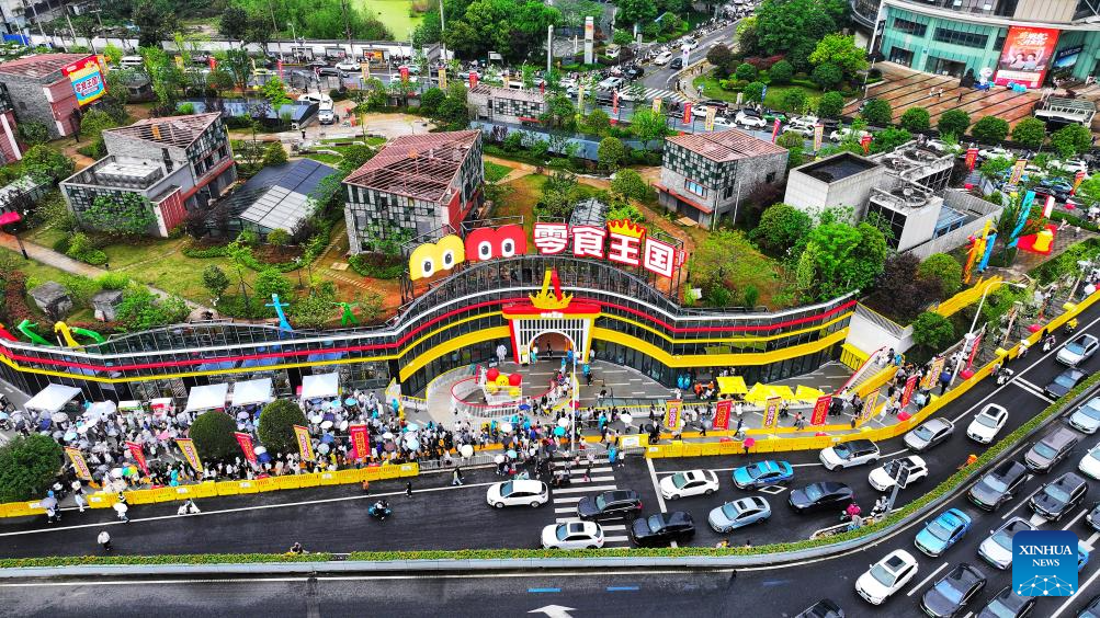 CHANGSHA, 17 abril, 2026 (Xinhua) -- Vista aérea tomada con dron el 17 de abril de 2026 de una gran tienda de bocadillos, en Changsha, en la provincia de Hunan, en el centro de China. Una tienda de gran tamaño de bocadillos con una superficie de 12.000 metros cuadrados abrió en Changsha el viernes. Con más de 6.500 marcas y más de 35.000 productos, el establecimiento ofrece a los consumidores una experiencia de exploración que integra compras, interacción en redes sociales y actividades interactivas. (Xinhua/Ding Chunyu)