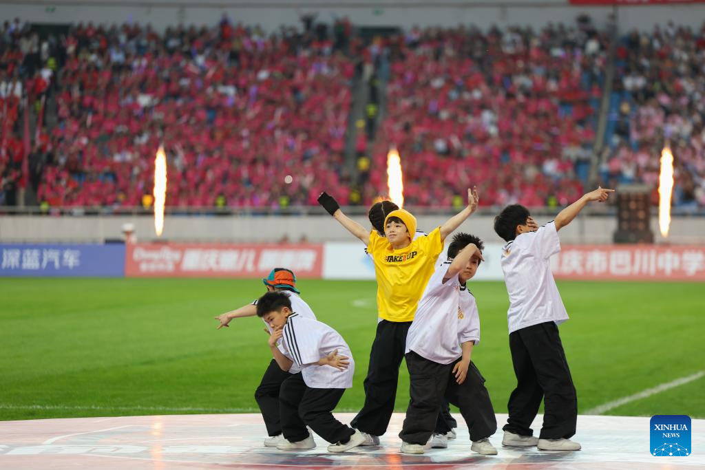 CHONGQING, 17 abril, 2026 (Xinhua) -- Imagen del 12 de abril de 2026 de Li Yongqiu (c) realizando una presentación previo al partido final de Liga de fútbol de la ciudad de Chongqing, en Chongqing, en el suroeste de China. Li Yongqiu, un niño chino de 13 años, obtuvo la medalla de oro en el "Junior Dance Tour" en las Finales Mundiales de "Juste Debout 2026" en París, Francia, el 8 de marzo de 2026, haciendo historia. Durante la final, Li presentó una rutina especial en la que combinó movimientos de breakdance con kung fu. (Xinhua/Huang Wei)