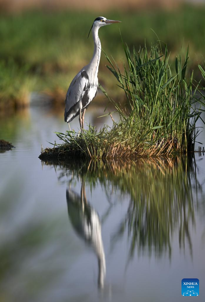 YINCHUAN, 19 abril, 2026 (Xinhua) -- Imagen del 18 de abril de 2026 de una garza descansando en el punto escénico de Shahu, en Shizuishan, en la región autónoma hui de Ningxia, en el noroeste de China. (Xinhua/Feng Kaihua)