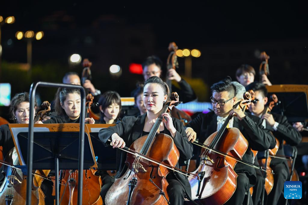 TIANJIN, 19 abril, 2026 (Xinhua) -- Imagen del 18 de abril de 2026 de miembros de la Orquesta Sinfónica de Tianjin realizando una presentación en la Plaza Jinwan a orillas del río Haihe, en Tianjin, en el norte de China. El ciclo de conciertos Serie de Música Junto al Puente dio comienzo aquí el sábado. (Xinhua/Sun Fanyue)