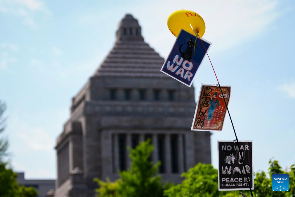 Personas se reúnen alrededor del edificio del Parlamento para protestar contra los intentos del Gobierno de la primera ministra japonesa, Sanae Takaichi, de modificar la Constitución pacifista del país y para demandar la protección del artículo 9, en Tokio, Japón, el 19 de abril de 2026. Alrededor de 36.000 personas participaron en el mitin, dijeron los organizadores, en la segunda protesta desde el 8 de abril que atrae a más de 30.000 personas cerca de la sede de la Dieta Nacional contra la modificación de la Constitución. (Xinhua/Jia Haocheng)