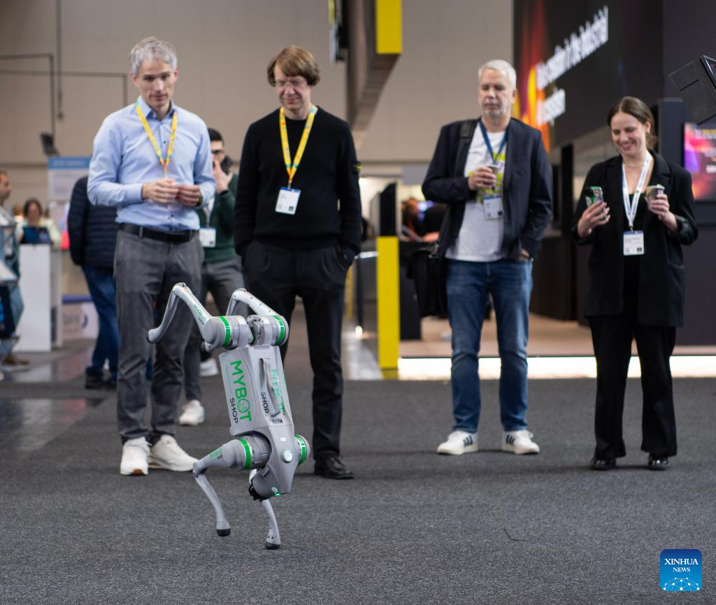 HANNOVER, 20 abril, 2026 (Xinhua) -- Personas observan un perro robótico en la Hannover Messe 2026, en Hannover, Alemania, el 20 de abril de 2026. La Hannover Messe 2026, la feria industrial más importante de Alemania, abrió sus puertas el lunes con la inteligencia artificial industrial y los robots humanoides como protagonistas por primera vez. (Xinhua/Zhang Haofu)