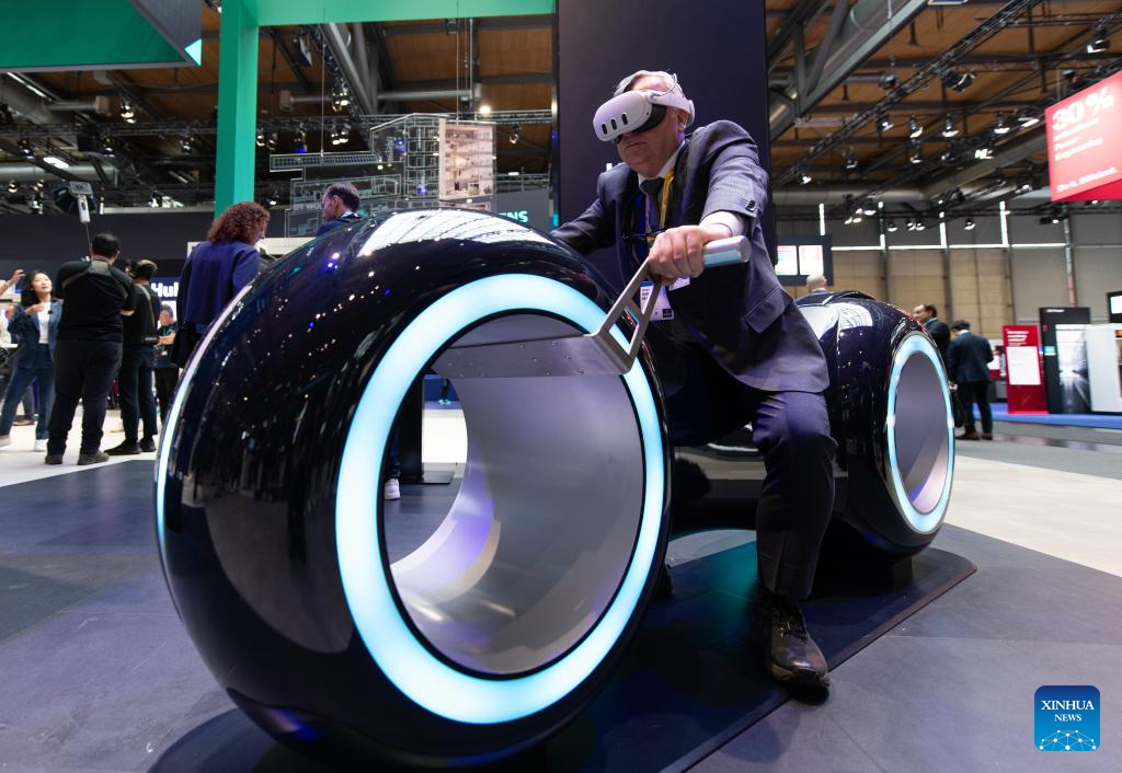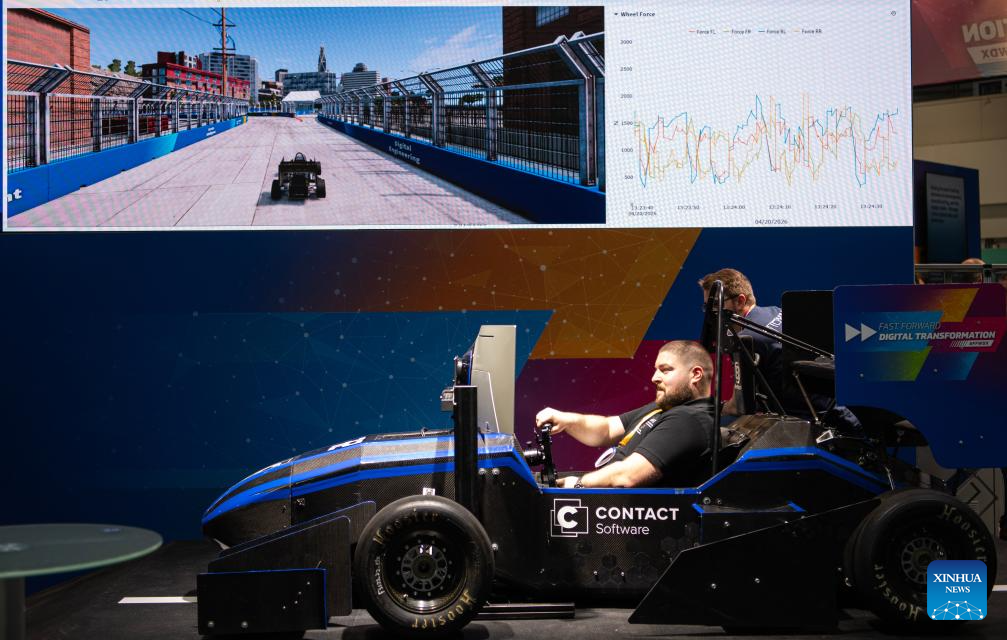 HANNOVER, 20 abril, 2026 (Xinhua) -- Un hombre prueba un simulador de carreras en la Hannover Messe 2026, en Hannover, Alemania, el 20 de abril de 2026. La Hannover Messe 2026, la feria industrial más importante de Alemania, abrió sus puertas el lunes con la inteligencia artificial industrial y los robots humanoides como protagonistas por primera vez. (Xinhua/Zhang Haofu)