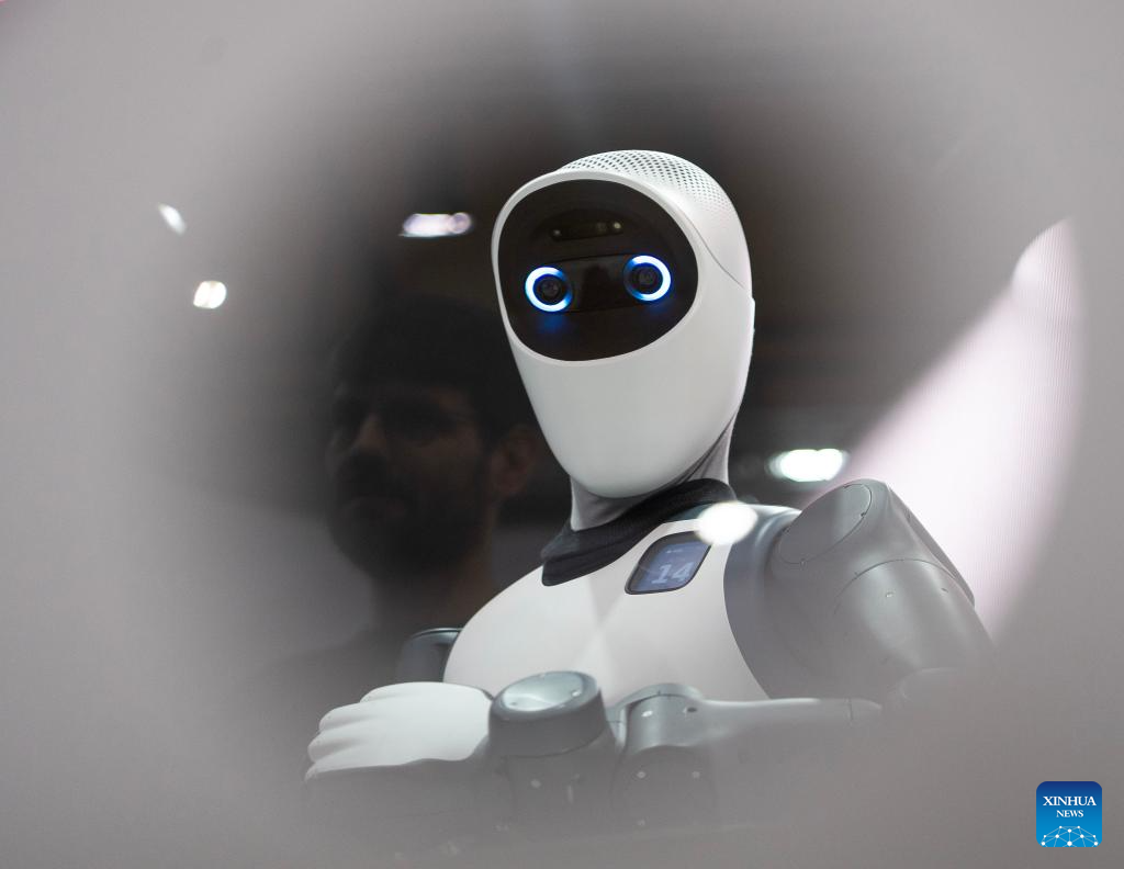 HANNOVER, 20 abril, 2026 (Xinhua) -- Un hombre observa un robot humanoide en el área de exposición de Agile Robots en la Hannover Messe 2026, en Hannover, Alemania, el 20 de abril de 2026. La Hannover Messe 2026, la feria industrial más importante de Alemania, abrió sus puertas el lunes con la inteligencia artificial industrial y los robots humanoides como protagonistas por primera vez. (Xinhua/Zhang Haofu)