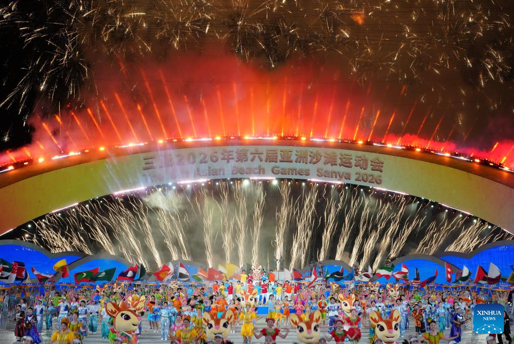 SANYA, 22 abril, 2026 (Xinhua) -- Fuegos artificiales estallan durante la ceremonia de apertura de los VI Juegos Asiáticos de Playa, en Sanya, en la provincia de Hainan, en el sur de China, el 22 de abril de 2026. (Xinhua/Zhao Yingquan)