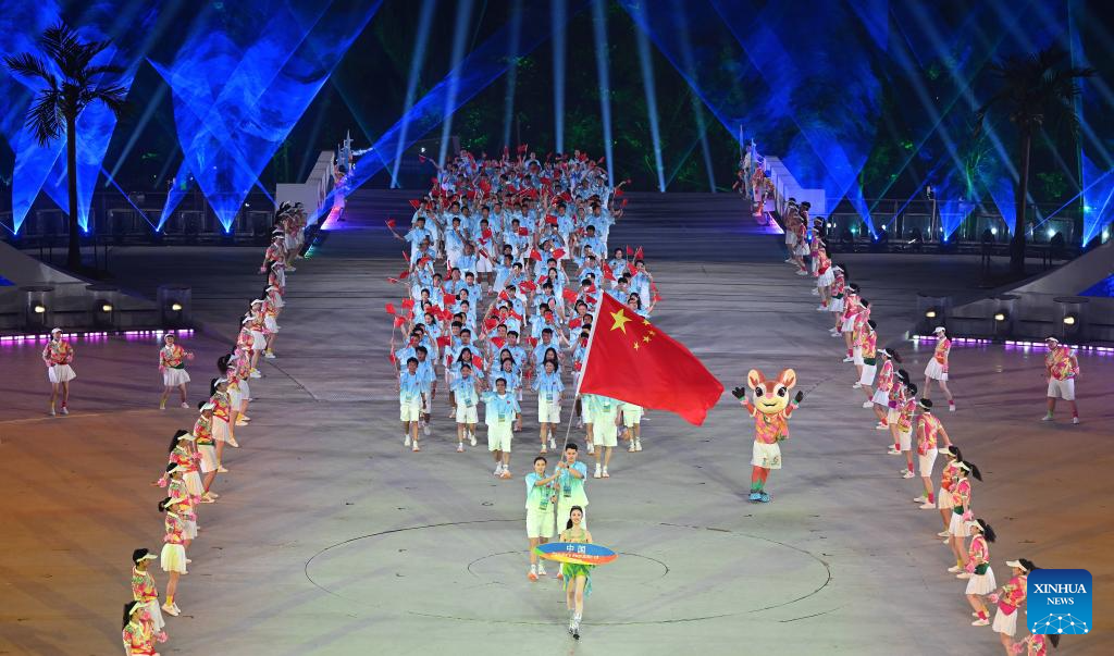 SANYA, 22 abril, 2026 (Xinhua) -- Integrantes de la delegación de China desfilan durante la ceremonia de apertura de los VI Juegos Asiáticos de Playa, en Sanya, en la provincia de Hainan, en el sur de China, el 22 de abril de 2026. (Xinhua/Zhao Yingquan)