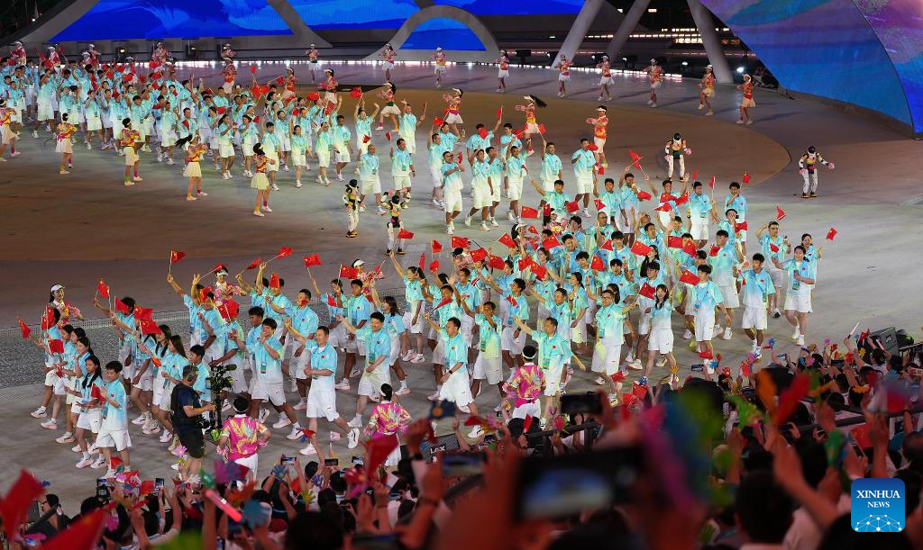 SANYA, 22 abril, 2026 (Xinhua) -- Integrantes de la delegación de China desfilan durante la ceremonia de apertura de los VI Juegos Asiáticos de Playa, en Sanya, en la provincia de Hainan, en el sur de China, el 22 de abril de 2026. (Xinhua/Li Ga)
