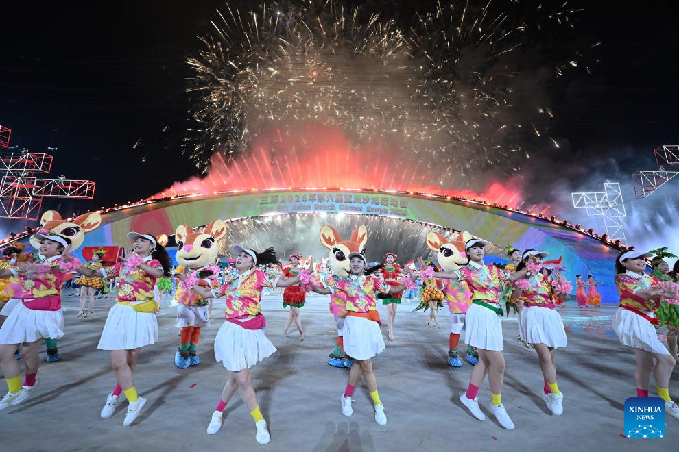 SANYA, 22 abril, 2026 (Xinhua) -- Artistas realizan una presentación durante la ceremonia de apertura de los VI Juegos Asiáticos de Playa, en Sanya, en la provincia de Hainan, en el sur de China, el 22 de abril de 2026. (Xinhua/Hu Jingwen)