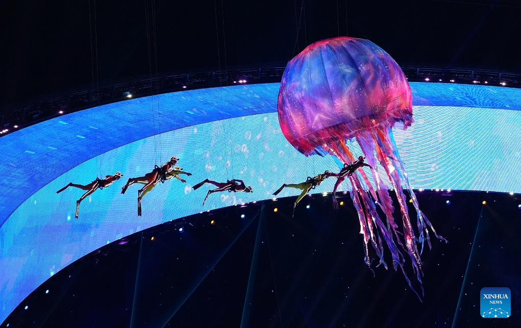 SANYA, 22 abril, 2026 (Xinhua) -- Artistas realizan una presentación durante la ceremonia de apertura de los VI Juegos Asiáticos de Playa, en Sanya, en la provincia de Hainan, en el sur de China, el 22 de abril de 2026. (Xinhua/Pan Yulong)