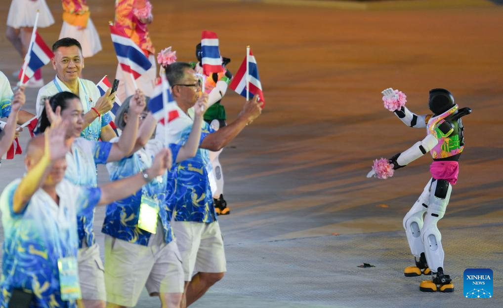 SANYA, 22 abril, 2026 (Xinhua) -- Integrantes de la delegación de Tailandia desfilan frente a un robot durante la ceremonia de apertura de los VI Juegos Asiáticos de Playa, en Sanya, en la provincia de Hainan, en el sur de China, el 22 de abril de 2026. (Xinhua/Li Ga)