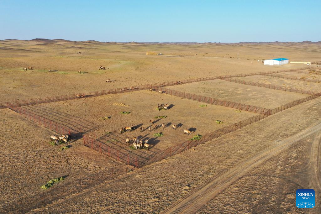 CHANGJI, 22 abril, 2026 (Xinhua) -- Vista aérea tomada con un dron el 21 de abril de 2026 de caballos de Przewalski en una estación de monitoreo en la Reserva Natural de Kalamaili, en la región autónoma uygur de Xinjiang, en el noroeste de China. Un total de 30 caballos de Przewalski fueron reintroducidos con éxito en la Reserva Natural de Kalamaili el miércoles, tras completar su entrenamiento de reintroducción a la vida silvestre. (Xinhua/Ding Lei)