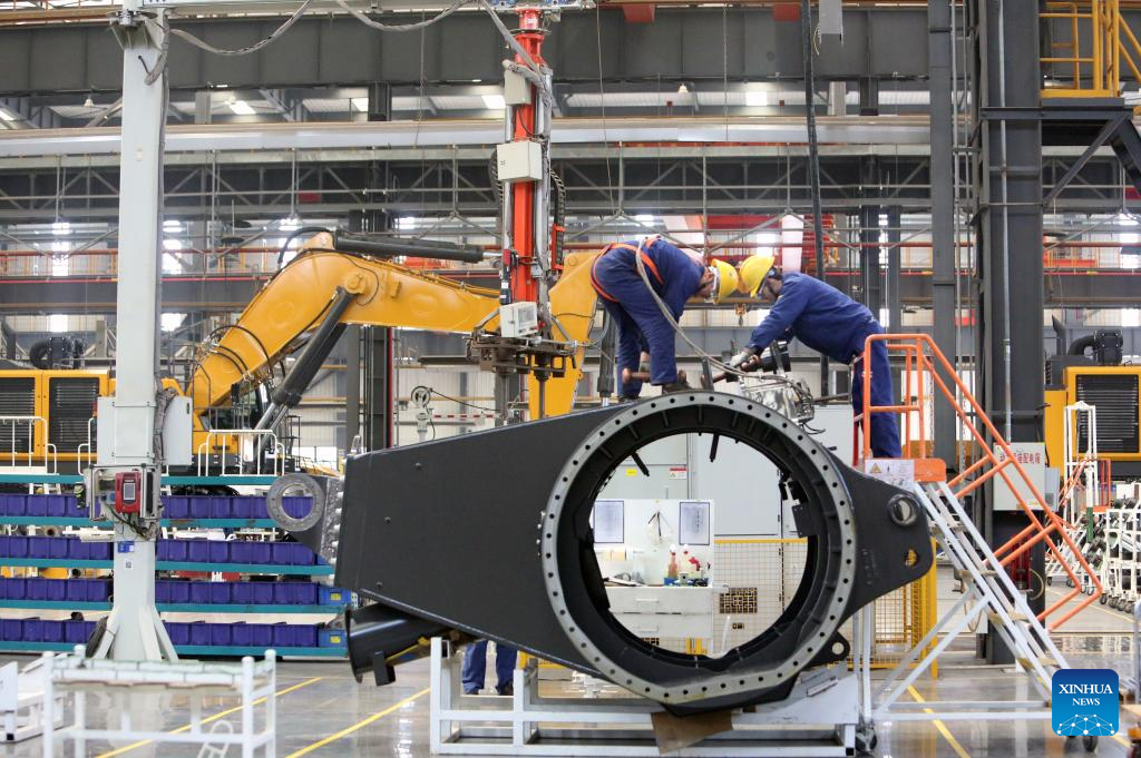 NANJING, 22 abril, 2026 (Xinhua) -- Imagen del 25 de marzo de 2026 de empleados trabajando en un taller de Xuzhou Construction Machinery Group Co., Ltd., en la ciudad de Xuzhou, en la provincia de Jiangsu, en el este de China. En los últimos años, Jiangsu se ha centrado en desarrollar nuevas fuerzas productivas de calidad, apostando por un desarrollo de alta gama, inteligente y globalizado, utilizando la manufactura avanzada para impulsar un crecimiento económico de alta calidad. (Xinhua/Cheng Li)