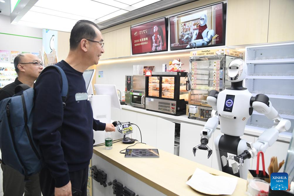 BEIJING, 22 abril, 2026 (Xinhua) -- Un robot humanoide agarra una salchicha a la parrilla en una tienda de conveniencia, en el distrito de Haidian de Beijing, capital de China, el 22 de abril de 2026. Un robot humanoide de gran tamaño ha sido instalado recientemente en una tienda de conveniencia en el distrito de Haidian para prestar servicio de forma regular. El robot se encarga de recibir a los clientes, responder a preguntas sobre los productos, proporcionar información sobre promociones y entregar los productos. (Xinhua/Ren Chao)