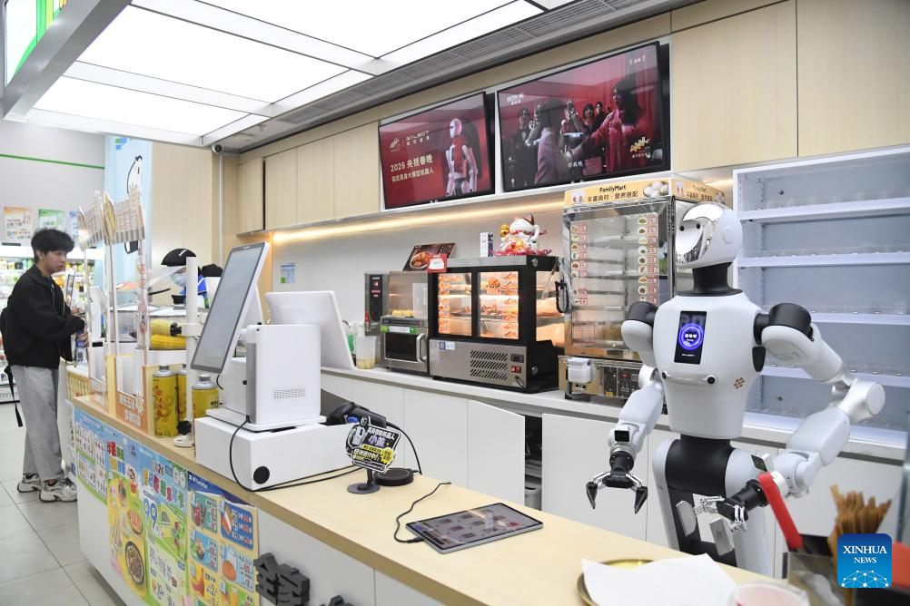 BEIJING, 22 abril, 2026 (Xinhua) -- Un robot humanoide trabaja en una tienda de conveniencia, en el distrito de Haidian de Beijing, capital de China, el 22 de abril de 2026. Un robot humanoide de gran tamaño ha sido instalado recientemente en una tienda de conveniencia en el distrito de Haidian para prestar servicio de forma regular. El robot se encarga de recibir a los clientes, responder a preguntas sobre los productos, proporcionar información sobre promociones y entregar los productos. (Xinhua/Ren Chao)
