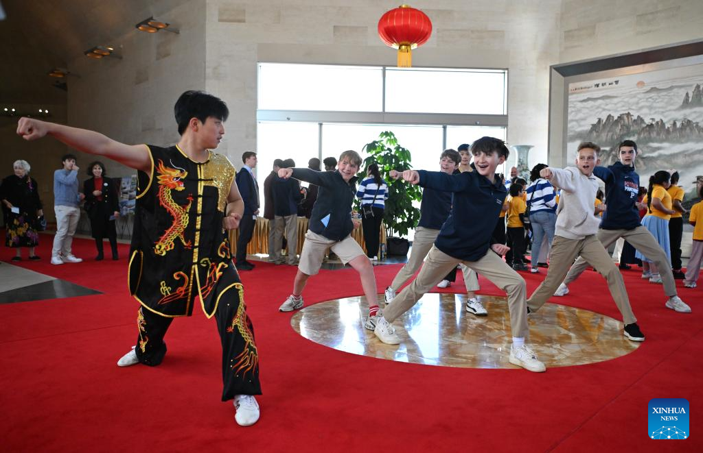 WASHINGTON, 22 abril, 2026 (Xinhua) -- Imagen del 21 de abril de 2026 de un actor de China guiando a estudiantes estadounidenses para realizar una presentación de artes marciales chinas en celebración del Día Internacional de la Lengua China en la Embajada de China, en Washington D. C., Estados Unidos. (Xinhua/Li Rui)