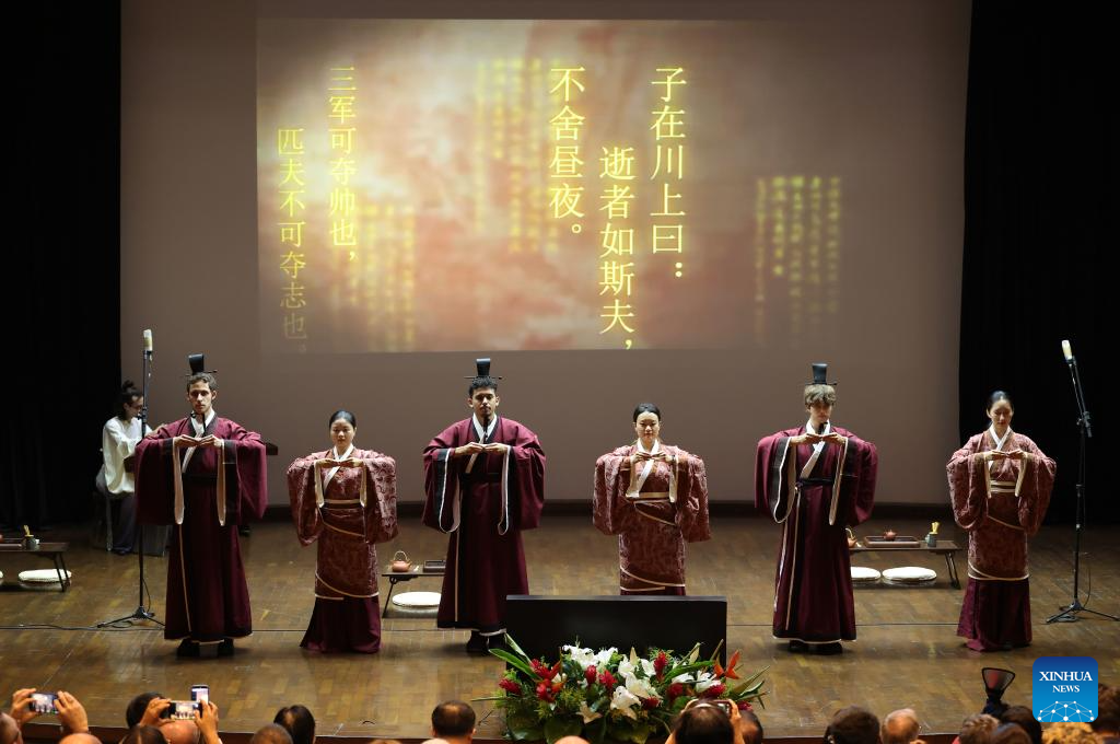 BELO HORIZONTE, 23 abril, 2026 (Xinhua) -- Imagen del 22 de abril de 2026 de intérpretes realizando demostraciones de arte con té durante el evento de inauguración de una exposición itinerante titulada "El Sabor que Cruza Montañas y Mares: La Ruta del Té y el Viaje del Café" en la Universidad Federal de Minas Gerais, en Belo Horizonte, Brasil, el 22 de abril de 2026. Como parte de una serie de eventos celebrados durante el "Año Cultural China-Brasil", la exposición itinerante abrió sus puertas aquí el miércoles. (Xinhua/Jin Haoyuan)