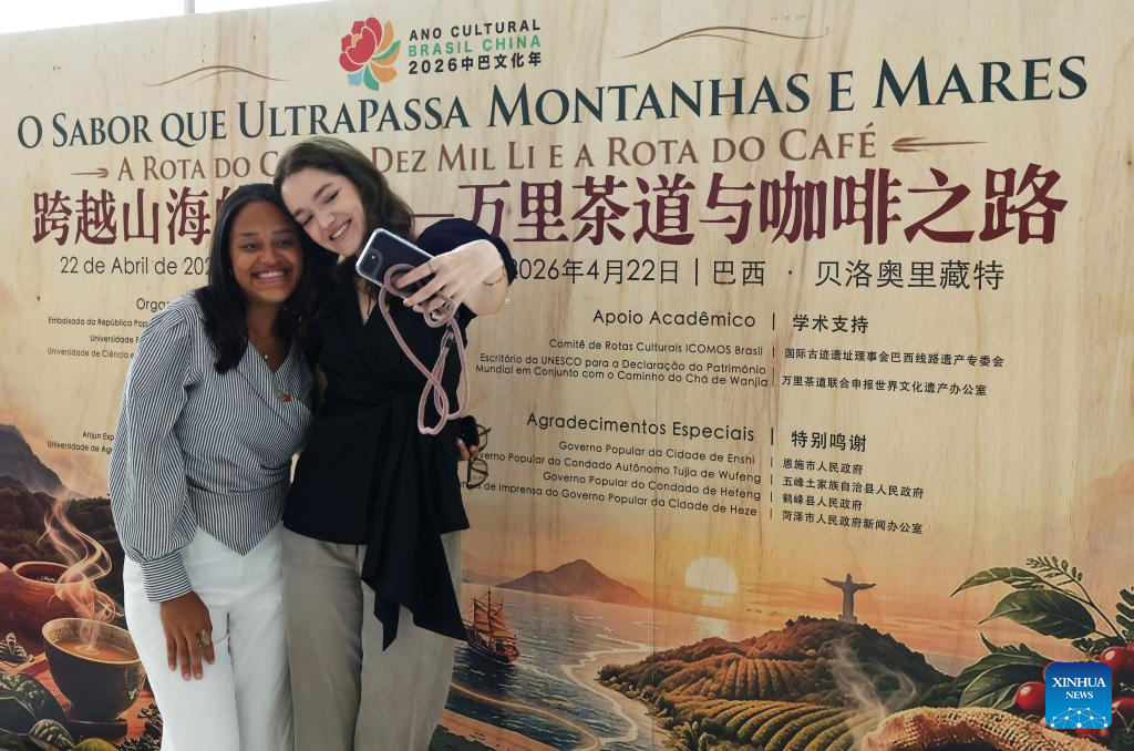 BELO HORIZONTE, 23 abril, 2026 (Xinhua) -- Imagen del 22 de abril de 2026 de invitadas tomándose fotografías durante el evento de inauguración de una exposición itinerante titulada "El Sabor que Cruza Montañas y Mares: La Ruta del Té y el Viaje del Café" en la Universidad Federal de Minas Gerais, en Belo Horizonte, Brasil, el 22 de abril de 2026. Como parte de una serie de eventos celebrados durante el "Año Cultural China-Brasil", la exposición itinerante abrió sus puertas aquí el miércoles. (Xinhua/Jin Haoyuan)