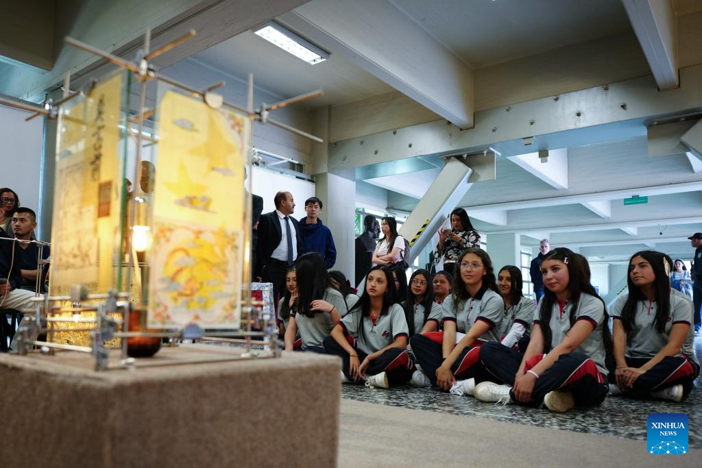 Imagen del 23 de abril de 2026 niños observando la obra "La luz del sueño en los caracteres chinos" durante la celebración del Día Internacional del Idioma Chino en la Universidad Jorge Tadeo Lozano, en Bogotá, Colombia. Estudiantes y cuerpo docente de la Universidad Jorge Tadeo Lozano de Bogotá celebraron el jueves el Día Internacional del Idioma Chino en un evento en este centro educativo que lleva 13 años enseñando mandarín. (Xinhua/Andrés Moreno)