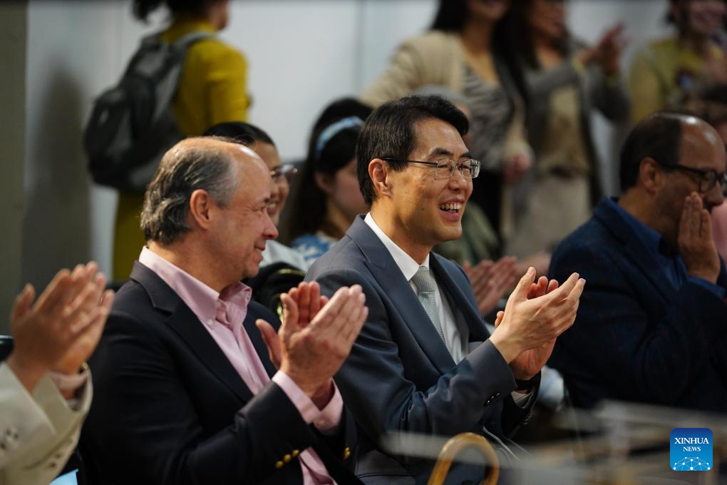 Imagen del 23 de abril de 2026 del embajador chino en Colombia, Zhu Jingyang (c), y Francisco José Lloreda (i), rector de la Universidad Jorge Tadeo Lozano, aplaudiendo durante la celebración del Día Internacional del Idioma Chino en la Universidad Jorge Tadeo Lozano, en Bogotá, Colombia. Estudiantes y cuerpo docente de la Universidad Jorge Tadeo Lozano de Bogotá celebraron el jueves el Día Internacional del Idioma Chino en un evento en este centro educativo que lleva 13 años enseñando mandarín. (Xinhua/Andrés Moreno)