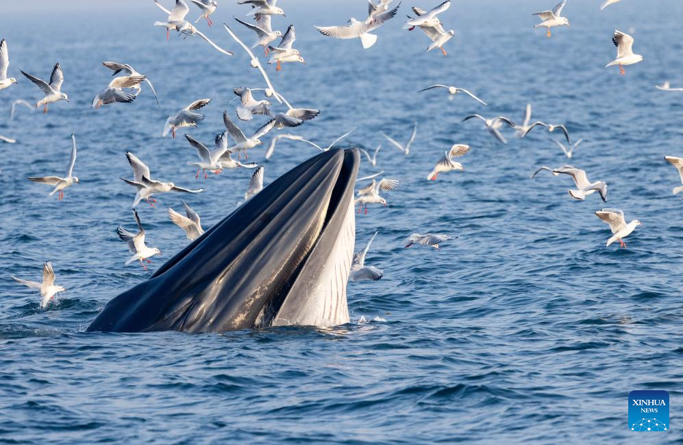 NANNING, 23 abril, 2026 (Xinhua) -- Imagen del 14 de enero de 2026 de un rorcual de Bryde avistado frente a la isla de Weizhou, en la ciudad de Beihai, en la región autónoma de la etnia zhuang de Guangxi, en el sur de China. Los rorcuales de Bryde, una especie protegida de primera categoría en China que puede alcanzar los 15 metros de longitud y pesar hasta 20 toneladas, prácticamente habían desaparecido de estas aguas durante décadas. Pero ahora, este tramo del golfo es el único lugar costero conocido del país donde los animales aparecen de forma regular cada año, llegando en diciembre y permaneciendo hasta abril. (Xinhua/Academia de Ciencias de Guangxi)