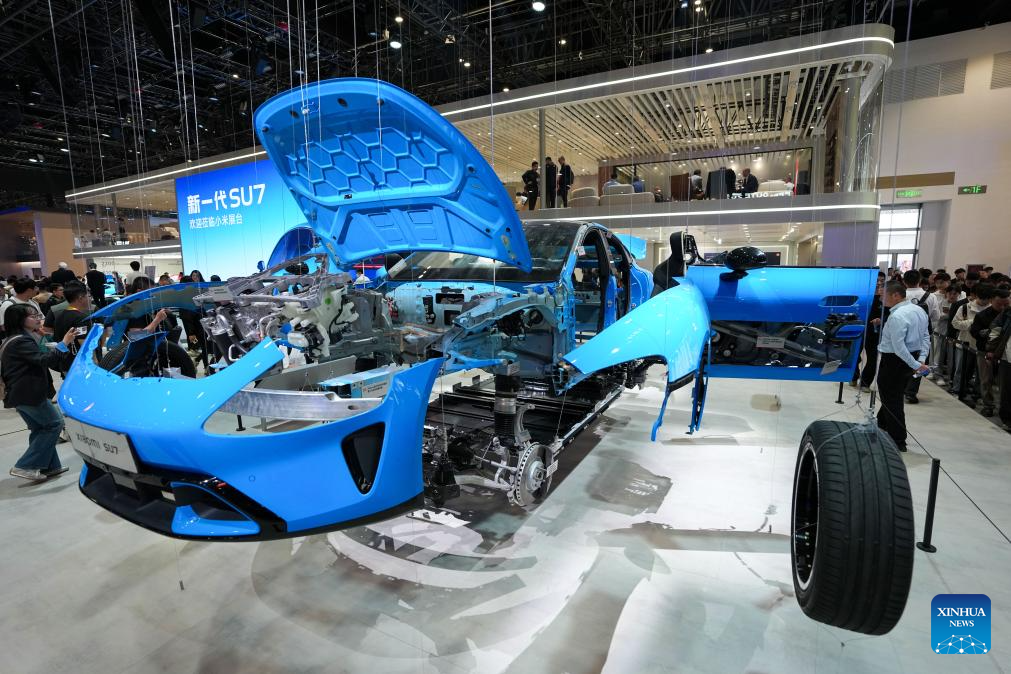 BEIJING, 24 abril, 2026 (Xinhua) -- Personas visitan el estand de Xiaomi durante la Exposición Internacional Automotriz de Beijing 2026, en Beijing, capital de China, el 24 de abril de 2026. La exposición comenzó aquí el viernes y se extenderá hasta el 3 de mayo. (Xinhua/Ju Huanzong)