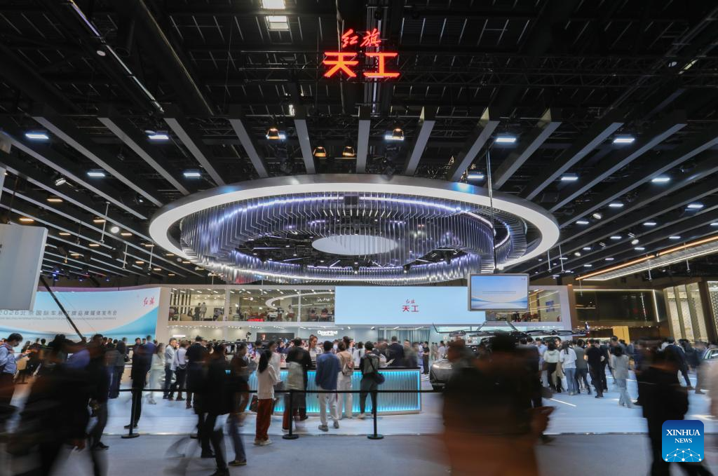 BEIJING, 24 abril, 2026 (Xinhua) -- Imagen del 24 de abril de 2026 del estand de Hongqi Tiangong durante la Exposición Internacional Automotriz de Beijing 2026, en Beijing, capital de China. La exposición comenzó aquí el viernes y se extenderá hasta el 3 de mayo. (Xinhua/Chang Nengjia)